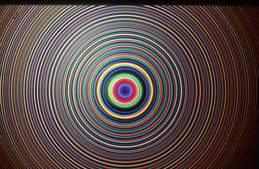 ´ÙÀ½ »çÁøÀº ½ºÅ©¸°¿¡ ºñÃß¾îÁø °£¼·¹«´ÌÀÇ ÇÑ ¿¹·Î ±¤¿ø¿¡ Æ÷ÇÔµÈ ¿©·¯ ´Ü»ö±¤ÀÌ µ¿½É¿øÀ» º¹ÀâÇÏ°Ô ¸¸µç °ÍÀ» º¸¿©ÁØ´Ù. ÀÌ´Â ÆÄÀå¿¡ µû¶ó À§»óÂ÷($\Delta$)°¡ ´Ù¸£°Ô °è»êµÇ±â ¶§¹®ÀÌ´Ù. °¢ ÆÄÀåÀÇ ºûÀÌ ´Ù¸¥ °£°ÝÀÇ µ¿½É¿øÀ» ¸¸µé°í ¸ðµÎ ¾î¿ì·¯Á®¼ º¹ÀâÇÑ ¹«´Ì¸¦ ÀÌ·é °ÍÀÌ´Ù. ½ºÅ©¸°¿¡ ºñÃß¾îÁø ¹«´Ì·ÎºÎÅÍ ÆÄÀåÀ» ȯ»êÇÒ ¼ö ÀÖ¾î ÀÌ °£¼·°è´Â ¾ÆÁÖ Á¤±³ÇÑ ºÐ±¤°è·Î ¾µ ¼ö ÀÖ´Ù. ¸¸ÀÏ $F$°¡ Ä¿¼ ÷¿¹ÇÑ ¼± ½ºÆåÆ®·³À» ¸¸µç´Ù¸é ÆÄÀåÀÇ ºÐÇØ´ÉÀº ±Ø´ë鵃 °ÍÀÌ´Ù.