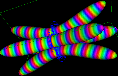 ¾Æ·¡ ±×¸²¿¡¼ ¿¡¸£¹ÌÆ®-°¡¿ì½º ºö¿¡¼ ÁøÆøÀÌ ÀÏÁ¤ÇÑ ¿µ¿ª, Áï µî°í¸éÀÇ ÀÔüÀûÀÎ ¸ð½ÀÀ» ÆÄ¾ÇÇÒ ¼ö ÀÖ´Ù. ¾Æ¿ï·¯ °¢ ÁöÁ¡ÀÇ ºöÀÇ »ó´ëÀûÀÎ º¹¼ÒÀ§»óÀº HSV »ö¸ðÇüÀ¸·Î °°ÀÌ º¸¿©ÁØ´Ù. \eqref{eq8} ½Ä¿¡¼ È®ÀÎÇÒ ¼ö ÀÖ´Â °Íó·³ $(l+m+1)$ÀÇ Ç× ¶§¹®¿¡ ¼·Î ÀÎÁ¢ÇÑ ºûÁٱ⿡¼ÀÇ À§»óÀÌ °ÅÀÇ ¹ÝÀüµÇ´Â °ÍÀ» È®ÀÎÇÒ ¼ö ÀÖ´Ù. ƯÈ÷ ºöÀÇ Ç㸮ÀÎ $z=0$¿¡¼´Â ¿ÏÀüÈ÷ ¹ÝÀüµÈ´Ù. ¿©±â¼ ¿À¸¥ÂÊ ¾Æ·¡ÀÇ 'amplitude' ¶óµð¿À ¹öưÀ» ¼±ÅÃÇÏ¸é ºöÀÇ ¹à±âÀÇ µî°í¸éÀ» º¸¿©ÁØ´Ù. (¿À¸¥Æí ±×¸²Àº ¾Æ·¡ ÇÁ·Î±×·¥ÀÌ Á¤»óÀûÀ¸·Î ½ÇÇàµÇ¾úÀ» ¶§ÀÇ ¸ð½ÀÀ¸·Î $l=1, m=1$ ¸ðµåÀÌ´Ù. ÇÁ·Î±×·¥ÀÌ ½ÇÇàµÇ±â À§Çؼ´Â Java¿Í VTK°¡ Á¤»óÀûÀ¸·Î ¼³Ä¡µÇ¾î¾ß ÇÑ´Ù)