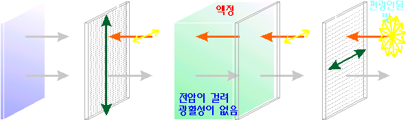 ¾×Á¤ÀÇ Àü±â-±¤ÇÐ È¿°ú¸¦ ÀÌ¿ëÇÑ Ç¥½ÃÀåÄ¡ÀÌ´Ù. ¾Æ·¡ ±×¸²ÀÇ ¾×Á¤Àº º¸ÅëÀÇ »óÅ¿¡¼ Ȱ¼ºÀ» ¶ç°í ÀÖ´Ù. ¿À¸¥Æí¿¡¼ Æí±¤µÇÁö ¾ÊÀº ÀÚ¿¬±¤À̳ª Á¶¸í±¤ÀÌ ÀÖÀ» ¶§ Ç¥¸éÀÇ Æí±¤ÀÚ¸¦ Åë°úÇÏ¿© ¼±ÇüÆí±¤ »óŰ¡ µÈ´Ù. ÀÌ ¼±ÇüÆí±¤ÀÇ ºûÀº Àü¾ÐÀÌ °É·ÁÀÖÁö ¾ÊÀº ¾×Á¤À» Åë°úÇÏ¸é ¼öÁ÷ÀÇ Æí±¤»óÅ·Π¹Ù²î±â ¶§¹®¿¡ °Å¿ï¾ÕÀÇ Æí±¤ÃàÀÌ ¼öÁ÷ÀÎ Æí±¤ÀÚ¸¦ Åë°úÇÏ¿© °Å¿ï¿¡¼ ¹Ý»çµÇ¾î µÇµ¹¾Æ ¿Ã ¼ö ÀÖ´Ù. ±×·¯³ª Àü¾ÐÀÌ °É·ÁÀÖÀ¸¸é °Å¿ï¾ÕÀÇ Æí±¤ÀÚ¸¦ Åë°úÇÏÁö ¸øÇÏ¿© ¹Ý»çµÇ´Â ºûÀ» º¼ ¼ö ¾ø´Ù.
